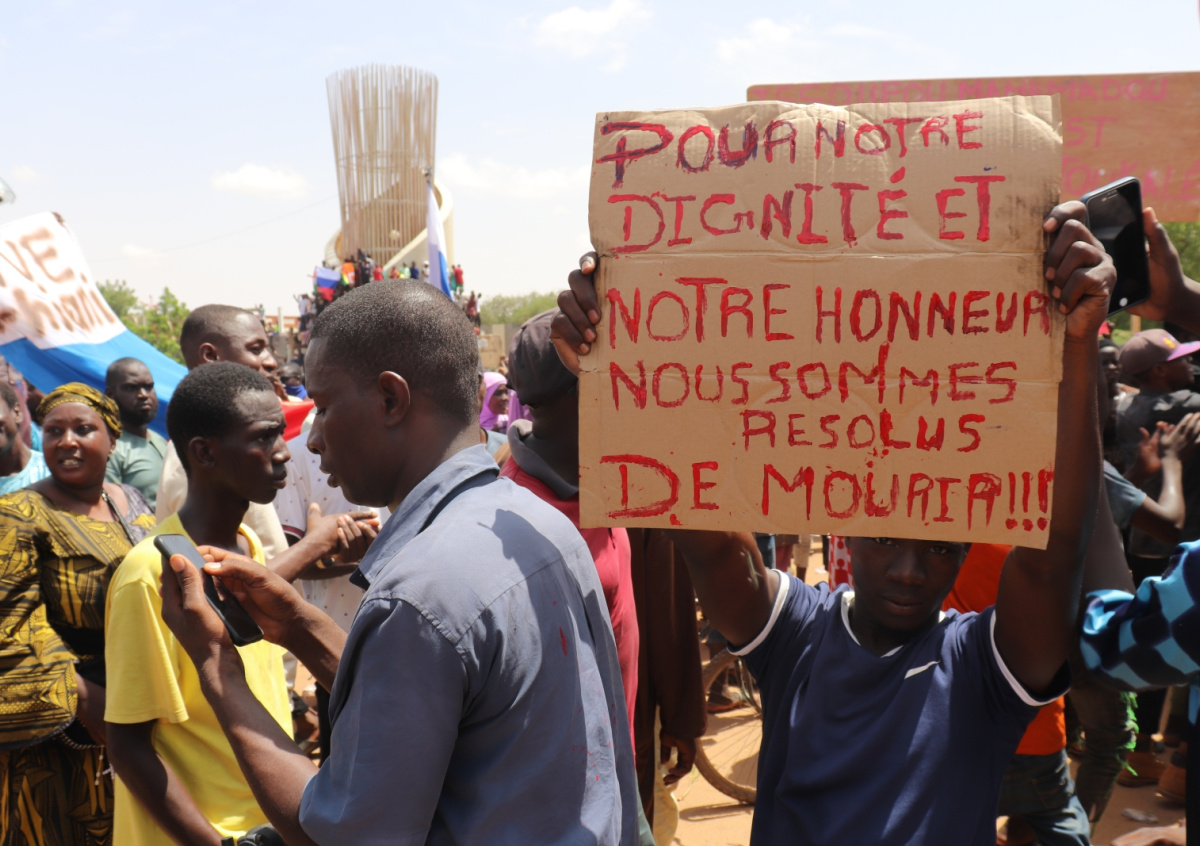 Нигер, Ниамей: демонстранты принимают участие в марше в поддержку заговорщиков в столице; справа мужчина держит табличку с надписью «Во имя нашего достоинства и нашей чести мы решили умереть!!!» Нигер, Ниамей: демонстранты принимают участие в марше в поддержку заговорщиков в столице; справа мужчина держит табличку с надписью «Во имя нашего достоинства и нашей чести мы решили умереть!!!» Фото: Djibo Issifou/dpa/Global Look Press