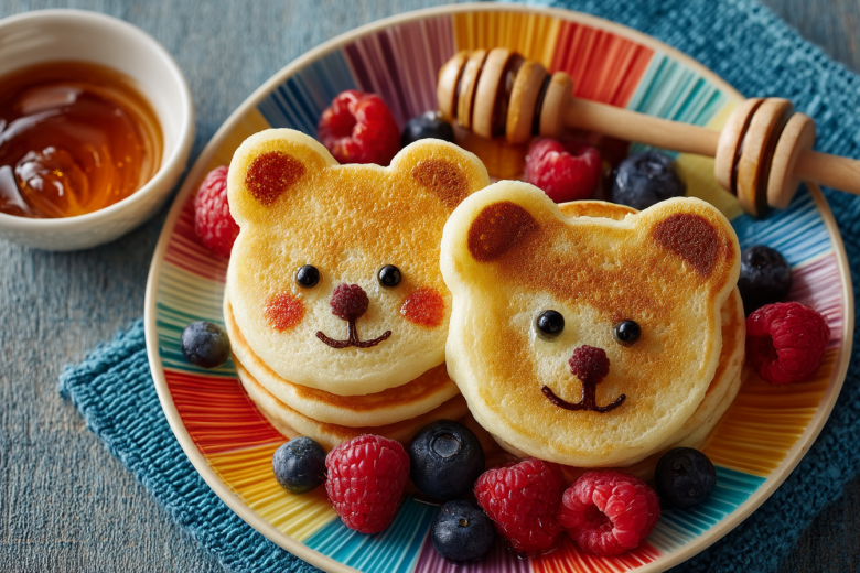 Нарисуйте круг-мордочку и два ушка. Через 30 секунд добавьте детали. Жарьте до румяности. Украсьте ягодами или шоколадными каплями.
