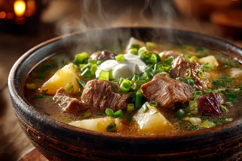 Наваристый мясной суп варят из говядины на косточке, сердца и печени. Мясо заливают 3 л холодной воды, доводят до кипения, снимают пену и томят 1,5 часа. За 25 минут до готовности добавляют лук и крупно нарезанный картофель. В конце кладут лавровый лист, соль, перец и возвращают нарезанное мясо в бульон.