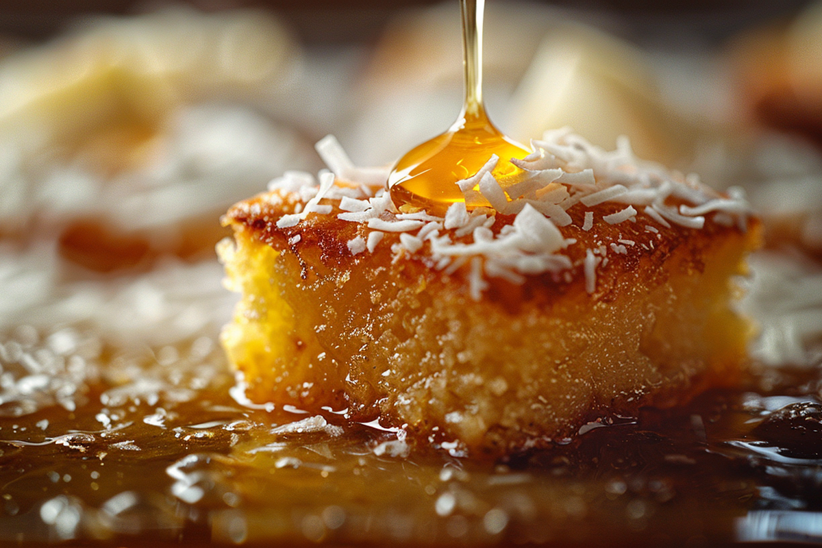 В миске смешайте стакан манки, стакан сахара, стакан йогурта или густого кефира, 100 г растопленного сливочного масла, два яйца, 50 г кокосовой стружки, чайную ложку разрыхлителя и щепотку соли. Оставьте на 30 минут. Вылейте тесто в смазанную форму. Выпекайте при 180 градусах 35 минут. Пока пирог печется, сварите сироп: смешайте полстакана сахара, полстакана воды и чайную ложку лимонного сока. Прокипятите 5 минут. Горячий манник залейте сиропом, дайте полностью остыть и пропитаться.