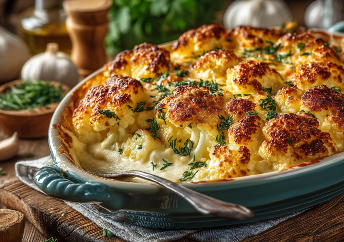 Цветная капуста, запеченная в яично-сметанной заливке, получается очень сочной. Это отличный вариант для тех, кто предпочитает легкие овощные блюда.