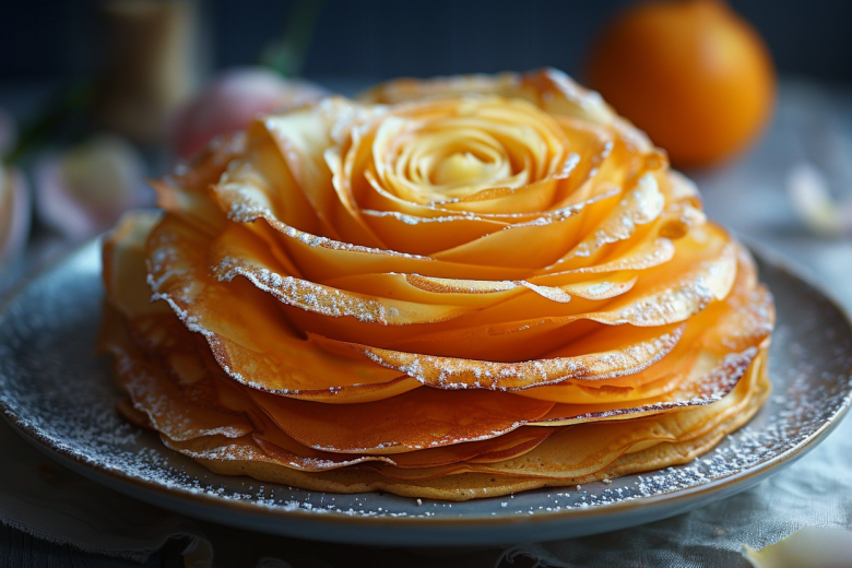 Возьмите плоское блюдо и положите на него 1 блин, смажьте его тонким слоем крема. Остальные блины разрежьте пополам. Каждую половинку смажьте кремом, сложите вдоль еще раз и сверните в неплотный рулетик. Ставьте эти «бутоны» вертикально на основу, двигаясь от центра к краям. Плотно прижимайте новые лепестки к предыдущим, формируя пышный цветок. Когда вся тарелка заполнится, аккуратно отогните края внешних блинчиков наружу, создавая эффект раскрывшегося бутона. Уберите конструкцию в холодильник на 3 часа для пропитки. Перед подачей украсьте основание торта 50 г свежей мяты.
