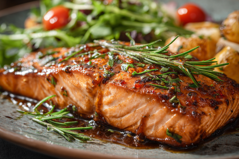 Разогрейте духовку до 200 °C. Противень застелите пергаментом и слегка смажьте маслом. Выложите филе кожей вниз. Щедро смажьте всю верхнюю поверхность и бока рыбы приготовленной глазурью, используя силиконовую кисточку или ложку. Не жалейте соуса — он и создаст ту самую эффектную карамельную корочку. Положите сверху на каждое филе по веточке розмарина.