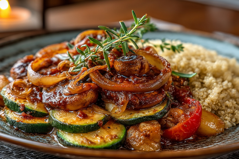 Ингредиенты для двоих: шампиньоны (300 г), кабачок (1 шт.), лук (1 шт.), томатная паста (2 ст. л.), масло (2 ст. л.), тимьян и перец. Нарежьте грибы и овощи, обжарьте лук до золотистости, добавьте все и тушите 15 минут под крышкой. В конце влейте пасту для соуса — получится нежно и ароматно. Украсьте веточкой тимьяна, подайте с киноа (100 г на порцию). Всего 280 ккал, но ощущение сытости гарантировано.