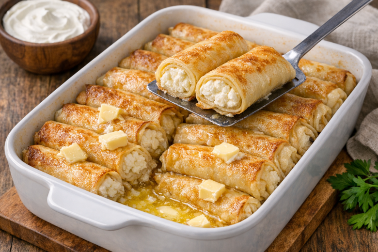 Для начинки возьмите 500 г жирного творога, разотрите его с 1 яйцом, 3 ст. л. сахара и 1 ч. л. ванилина до кремового состояния. Выложите немного творога на край каждого блина и сверните его тугой тонкой трубочкой. Разрежьте каждую трубочку пополам и плотно уложите в форму для запекания слоями. Каждый слой обязательно перекладывайте небольшими кусочками сливочного масла — всего вам понадобится около 60 г. Накройте форму крышкой или фольгой и отправьте в духовку при 150 градусах на 30 минут. За это время налистники пропитаются маслом.