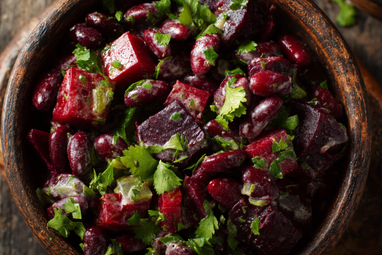 Ингредиенты: 200 г вареной свеклы, 100 г консервированной красной фасоли (слитой), 20 г свежей кинзы, 1 зубчик чеснока, 1 ст. л. натурального йогурта (0–2% жирности), щепотка кумина.