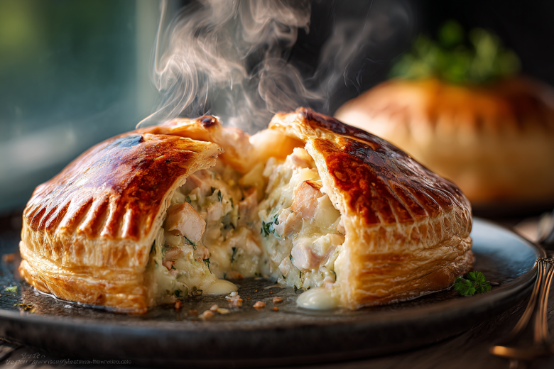 Это блюдо выглядит невероятно празднично благодаря эффектному куполу из теста, а начинка из рыбы, сливок и имбиря обладает изысканным, согревающим вкусом.