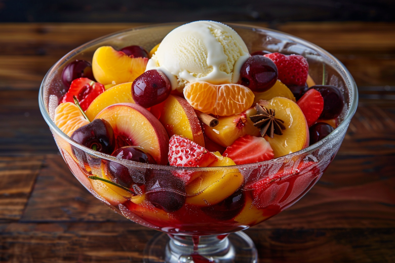Это не просто «какой-то» алкогольный десерт, а фруктовый карнавал в бокале! Вам понадобятся любые сезонные фрукты и ягоды — персики, клубника, вишня, апельсины. Нарежьте их крупно, чтобы хорошо чувствовался вкус.