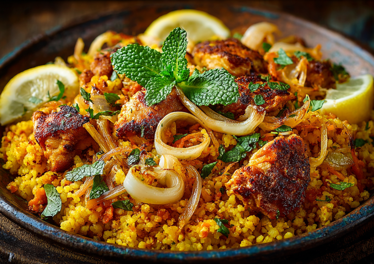 Верните в сковороду курицу, налейте два стакана горячего куриного бульона или воды, посолите по вкусу. Когда закипит, убавьте огонь, накройте крышкой и забудьте о пилаве минут на 20. За это время булгур впитает всю жидкость, станет рассыпчатым, а курица дойдет до готовности в пару. Выключите огонь, укутайте сковороду полотенцем и дайте настояться еще 10 минут. Перед подачей сбрызните пилав лимонным соком и посыпьте свежей мятой или кинзой. Это блюдо самодостаточно, но особенно хорошо идет с йогуртом, смешанным с толченым чесноком, — восточная классика работает безотказно.