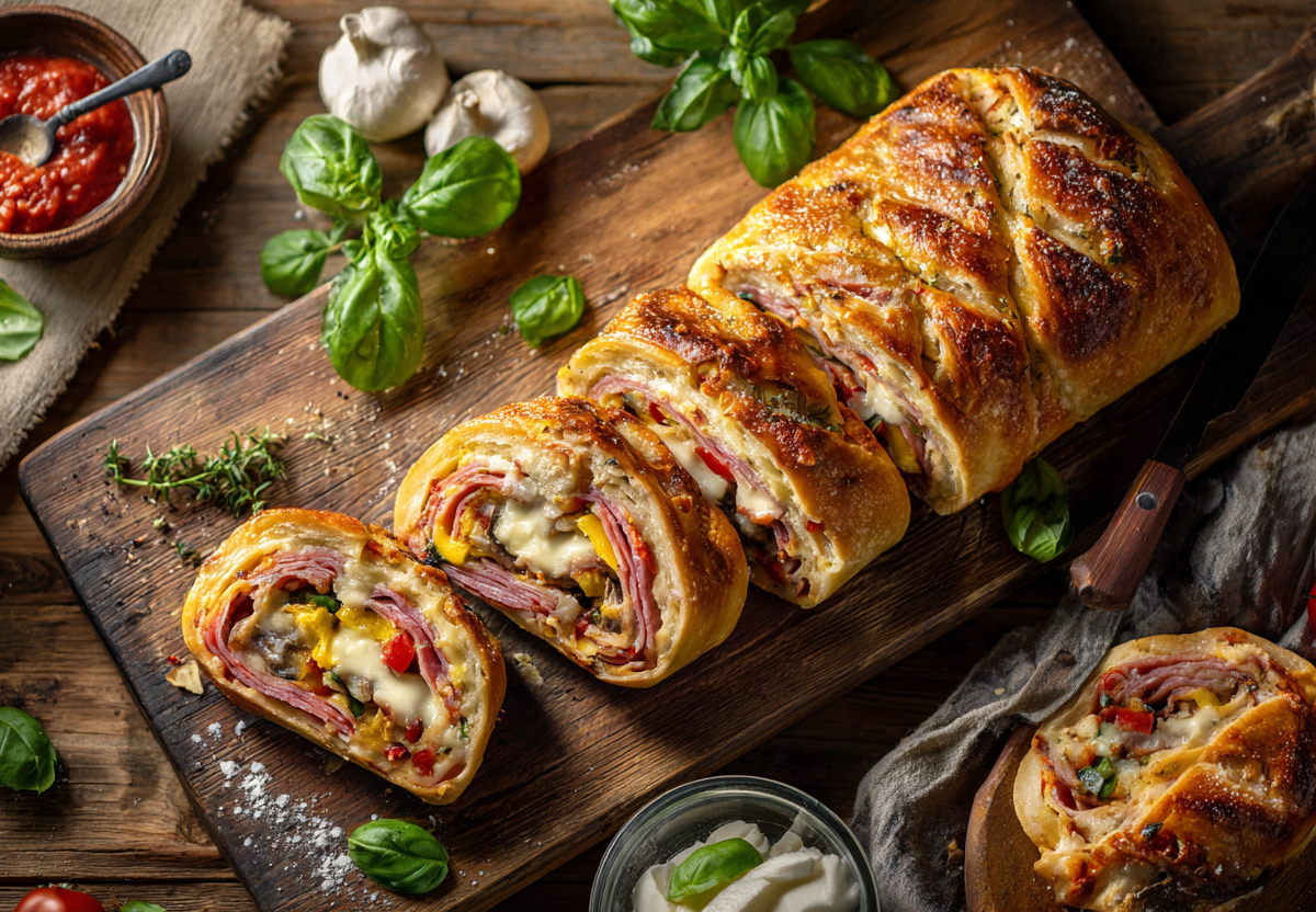 Возьмите 500 г готового дрожжевого теста (покупного или домашнего) и раскатайте его в прямоугольный пласт толщиной около 5 мм. Щедро смажьте поверхность 3 ст. л. томатного соуса или кетчупа, отступая от краев по паре сантиметров. Для начинки мелко нарежьте 200 г ветчины или салями, 1 болгарский перец и 5–6 маринованных шампиньонов. Равномерно распределите овощи и мясо по тесту, а сверху посыпьте 200 г тертой моцареллы или любого полутвердого сыра. Для аромата добавьте щепотку сушеного орегано или базилика.