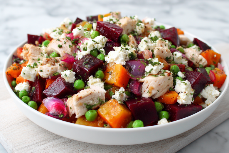 Начните с того, что тщательно вымойте свеклу, морковь и картофель, не очищая их от кожуры. Каждый овощ заверните отдельно в фольгу, слегка сбрызнув оливковым маслом и приправив щепоткой соли. Запекайте их в разогретой до 200 градусов духовке около часа или до мягкости. Проверить готовность можно тонкой деревянной шпажкой. Готовые овощи остудите прямо в фольге, а затем очистите и нарежьте кубиками среднего размера. Пока овощи остывают, нарежьте кубиками копченую куриную грудку, маринованные огурчики и красный лук. Сыр фету или брынзу лучше не резать, а аккуратно поломать руками на небольшие, неравномерные кусочки — так вкус в салате будет интереснее. В просторной салатнице бережно соедините все подготовленные компоненты, включая зеленый горошек, который предварительно нужно откинуть на сито, чтобы стек лишний маринад.