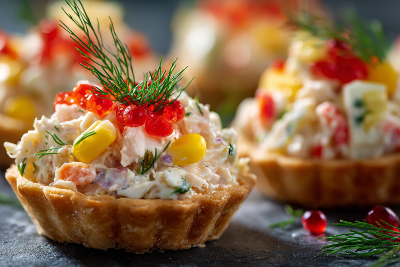 Такие тарталетки с крабовыми палочками всегда расходятся очень быстро. Их можно дополнить, добавив в массу мелко нарезанный свежий огурец для хруста. Эта холодная закуска идеально подходит для новогодней ночи, дня рождения или корпоратива. Просто, сытно и неизменно популярно.
