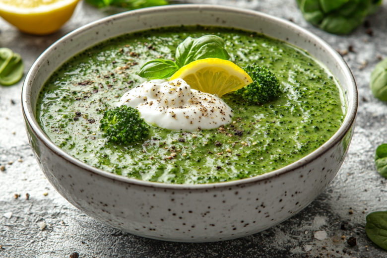 Начинаем с нарезки 200 г брокколи на соцветия и 100 г свежего шпината. В кастрюле разогреваем 1 ст. л. оливкового масла, добавляем мелко нарезанную луковицу и слегка обжариваем. Заливаем 1 л овощного бульона, добавляем брокколи и варим 10 минут. В конце добавляем шпинат и варим еще 3–5 минут до мягкости. Приправляем солью, перцем и щепоткой мускатного ореха. Можно подавать с долькой лимона для свежести.