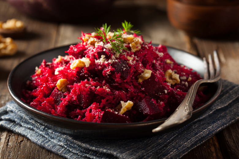 Оставьте салат из свеклы на 15–20 минут в холодильнике — так все вкусы лучше соединятся. Подавайте эту яркую закуску отдельно или как дополнение к мясным блюдам.