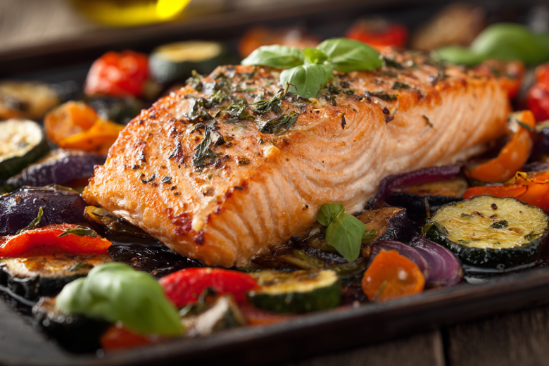 Вам понадобится: 2 стейка горбуши (около 250 г каждый), 1 кабачок, 1 баклажан, 2 спелых помидора, 1 красная луковица, 1 сладкий перец, 3 ст. л. оливкового масла, 2 зубчика чеснока, сок половины лимона, 1 ч. л. сушеного орегано, 1/2 ч. л. паприки, морская соль, свежемолотый черный перец и горсть свежего базилика для подачи.