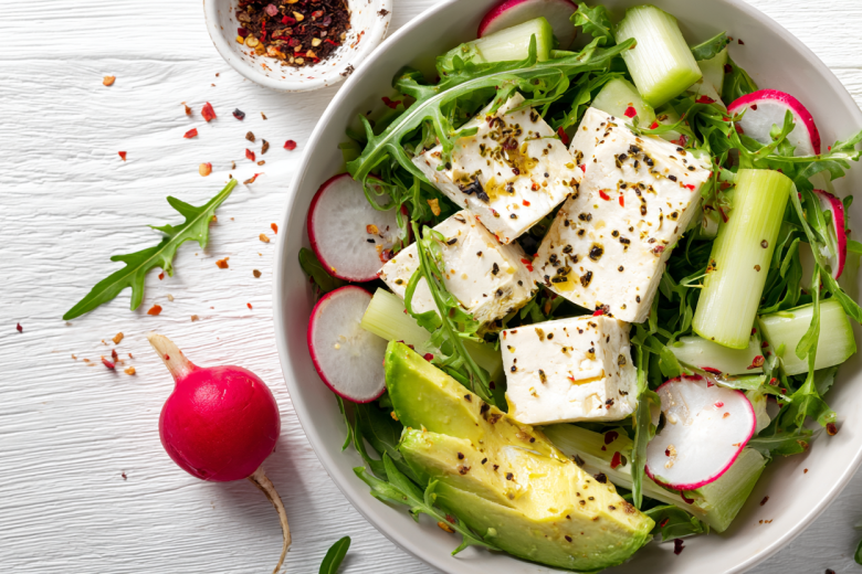 Тофу обеспечивает насыщение белком, авокадо содержит полезные жиры, овощи добавляют объем без калорий. Возьмите тофу (180 г), авокадо (половинку), сельдерей (2 стебля), редис (6 шт.), руколу (пучок) и лайм. Нарежьте тофу и овощи ломтиками, авокадо кубиками. Сбрызните соком лайма, добавьте щепотку соли и чили хлопья. Перемешайте нежно — салат готов! Поддерживает обмен веществ и не вызывает тяжести.