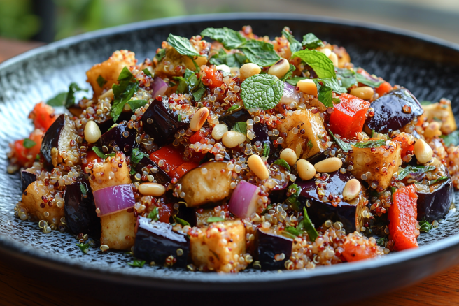 Далее для приготовления салата с баклажанами смешайте овощи в миске, добавьте 200 г отварного киноа, горсть рубленой мяты и 100 г раскрошенной брынзы. Для заправки взбейте 3 ст. л. оливкового масла, сок 1 лайма, 1 ч. л. меда и измельченный зубчик чеснока.