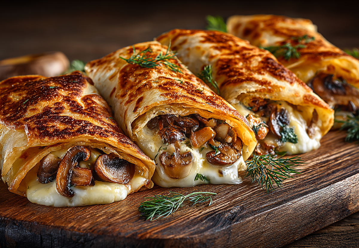 Посолите, поперчите по вкусу, добавьте два зубчика чеснока через пресс. Влейте 100 мл жирных сливок и тушите две минуты. Снимите с огня. Два листа тонкого лаваша разрежьте пополам. На каждую половину выложите грибную начинку, посыпьте 100 г тертой моцареллы или сулугуни. Сверните плотным рулетом или конвертом. Обжарьте на сухой сковороде с антипригарным покрытием по две минуты с каждой стороны до золотистой корочки и расплавленного сыра.