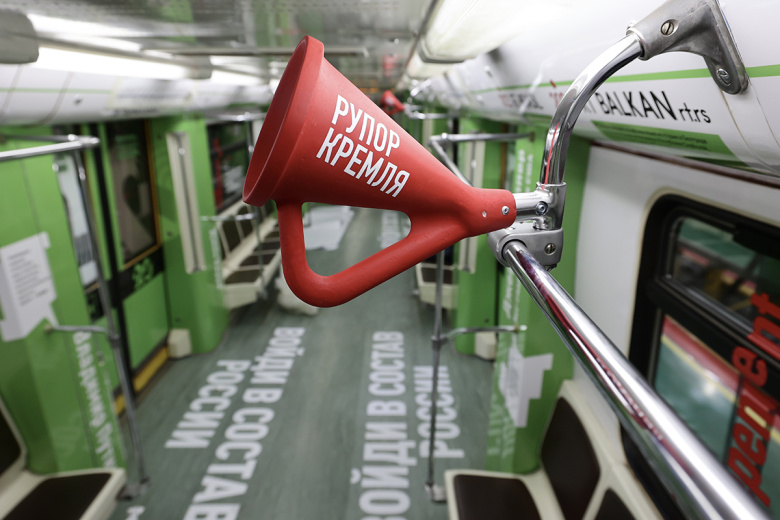 Кроме того, на поручнях в вагонах установлены конструкции в виде рупоров и микрофонов RT. Сама же передвижная инсталляция наполнена ироничными отсылками на тему работы международного телеканала за два десятилетия.