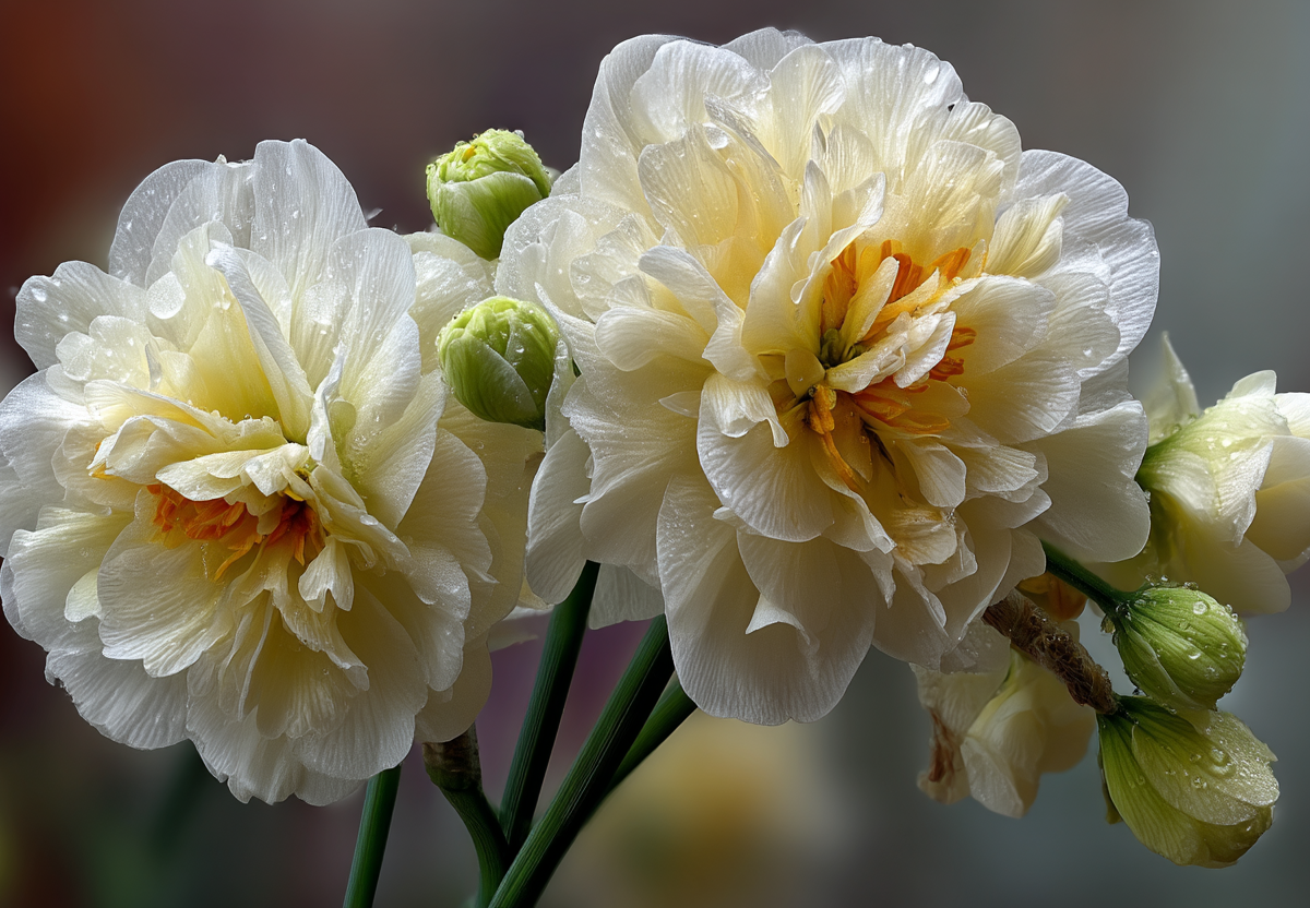 В начале цветения в центре преобладают яркие лимонно-желтые тона, а по краям — нежные сливочно-белые. По мере взросления цветок светлеет, превращаясь в белоснежное облако с легким лимонным оттенком в глубине. Цветение начинается в середине весны, обычно в апреле-мае, и продолжается до трех недель, наполняя сад тонким, сладковатым ароматом.