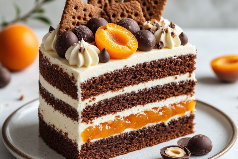 Этот торт словно съедобный луч летнего солнца, пойманный в нежную шоколадную оправу. Его характер определяет яркий солнечный вкус абрикосового конфитюра, который идеально оттеняет благородную горечь шоколадного бисквита. А хрустящие кусочки обжаренного фундука добавляют неожиданный акцент и приятную текстуру, создавая настоящее праздничное настроение в каждом слое.
