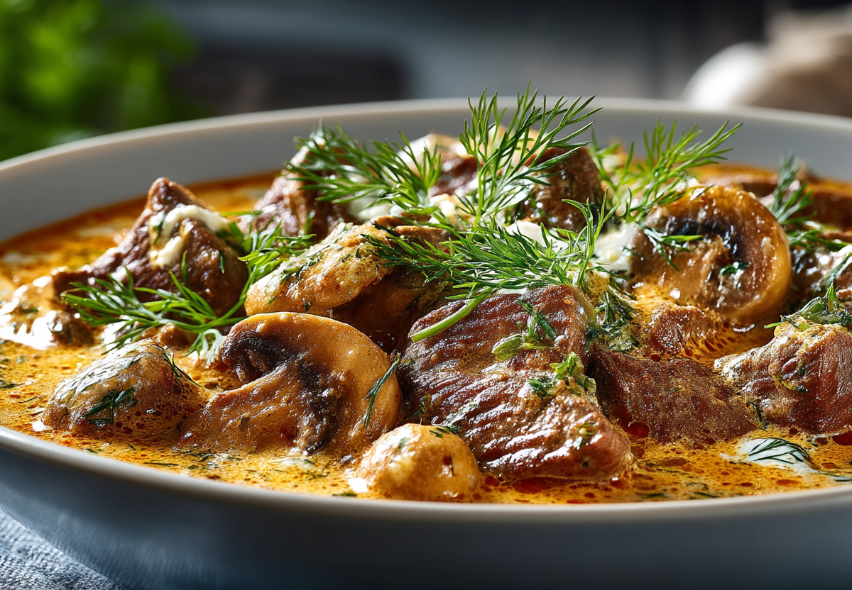 Говядина (лопатка или вырезка) — 500 г, луковица (крупная), чеснок — 2 зубчика, шампиньоны — 200 г, томатная паста — 1 ст. л., сметана (20%) — 150 г, бульон говяжий (или куриный) — 100 мл, масло растительное — 2 ч. л., паприка молотая — 1 ч. л., петрушка свежая — небольшой пучок, соль, перец черный молотый — по вкусу.