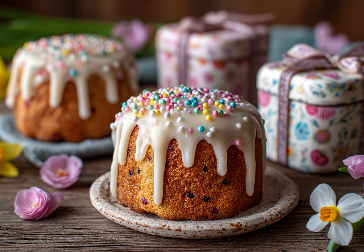 Для глазури взбиваю белок с сахарной пудрой и лимонным соком до крепких пиков. Покрываю остывшие куличи глазурью, сразу посыпаю цветной посыпкой. Даю глазури застыть. Упаковываю в бенто-боксы или крафтовые пакетики.