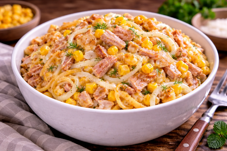 Приготовление: лук нарезаю тонкими полукольцами и быстро мариную — заливаю кипятком с каплей уксуса и щепоткой сахара, затем отжимаю. Из яиц и молока выпекаю тонкие яичные блинчики, остужаю и нарезаю соломкой. С копчёного окорочка снимаю мясо и тоже режу соломкой. В глубокой миске соединяю курицу, блинчики, лук и кукурузу. Слегка солю, заправляю майонезом и аккуратно перемешиваю. Салат получается нежным, ароматным и очень «солнечным» — его всегда разбирают первым и обязательно просят рецепт. Отличный вариант и на каждый день, и к праздничному столу.