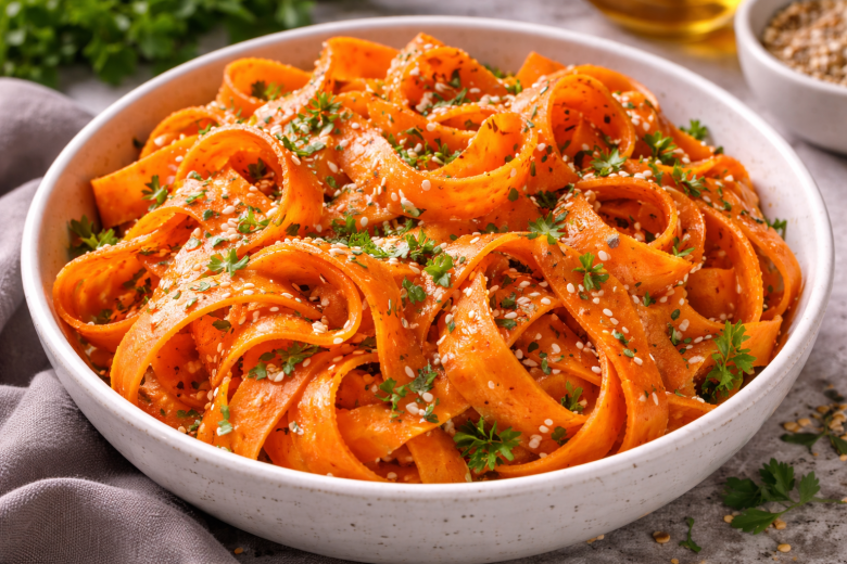 Как готовлю: морковь очищаю и с помощью обычной овощечистки нарезаю длинными лентами прямо в миску. Стараюсь не мельчить — именно ленты дают нужную текстуру и эффект. Для заправки смешиваю оливковое масло, лимонный сок, мед, соевый соус и мелко натертый чеснок. Добавляю немного перца или щепотку чили, если хочется остроты. Поливаю морковь заправкой и аккуратно перемешиваю руками, чтобы ленты стали мягче, но не потеряли хруст. Даем салату постоять 5–10 минут, перед подачей посыпаю кунжутом или семечками.