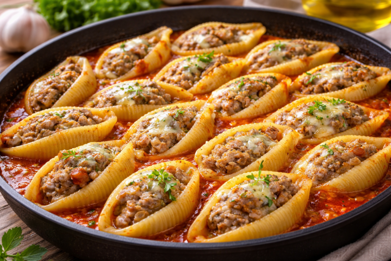 Когда нет времени долго стоять у плиты, выручает этот простой рецепт. Крупные макароны-ракушки сразу начиняются фаршем и готовятся прямо на сковороде в ароматном соусе. Макароны становятся мягкими, фарш — сочным, а ужин получается сытным и очень вкусным.