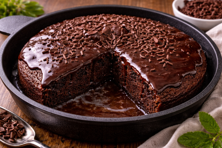 Этот пирог — моя настоящая палочка-выручалочка. Когда хочется чего-нибудь сладкого «прямо сейчас», а включать духовку нет ни времени, ни желания, я просто достаю сковороду. Всего по 50 граммов масла и какао — и через 20 минут на столе нежный шоколадный десерт, который выглядит так, будто с ним долго возились. Пирог получается очень мягким, влажным и буквально тает во рту.