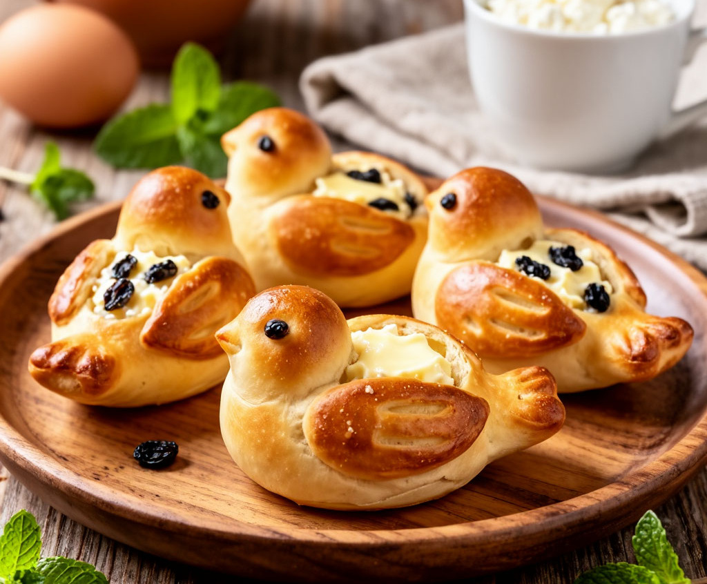 Для начинки смешайте творог с яйцом, сахаром и ванилином. Тесто разделите на шарики, раскатайте кружки, выложите начинку, сформируйте птичек: сделайте защип для хвостика, надрезы на спинке, вставьте глазки из изюма. Выпекайте при 180 °С 20–25 минут. Подавайте тёплыми — такие птички с творогом украсят пасхальный стол и согреют душу.