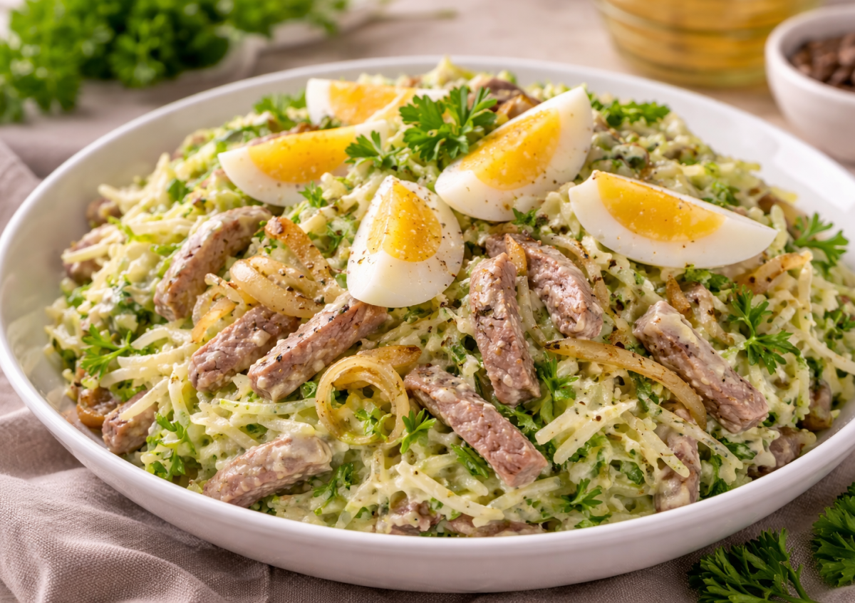 Основа — обычная зеленая редька, но именно она дает свежесть и легкую остринку. В сочетании с мягкой говядиной, яйцами и обжаренным луком получается очень сбалансированный вкус.