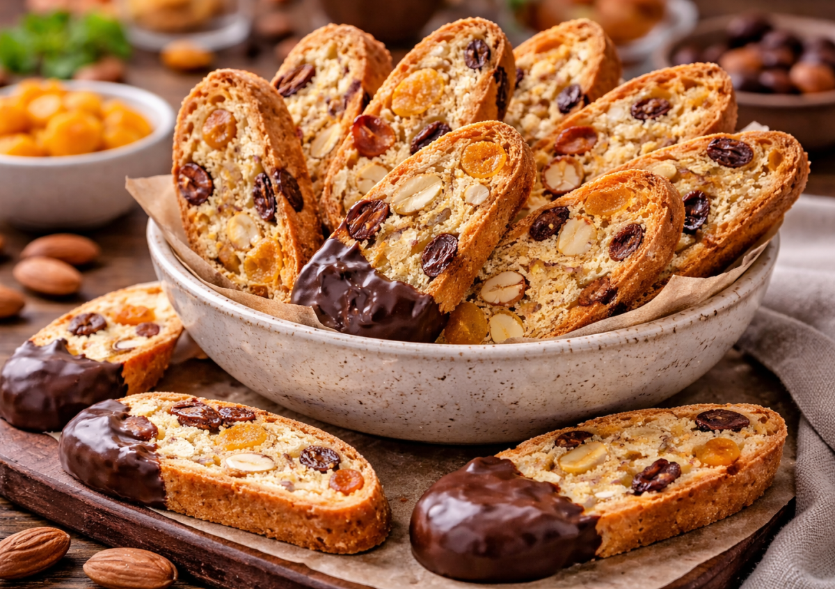 Главная особенность бискотти — двойная выпечка. Сначала тесто выпекают в виде батона, затем нарезают ломтиками и снова отправляют в духовку.