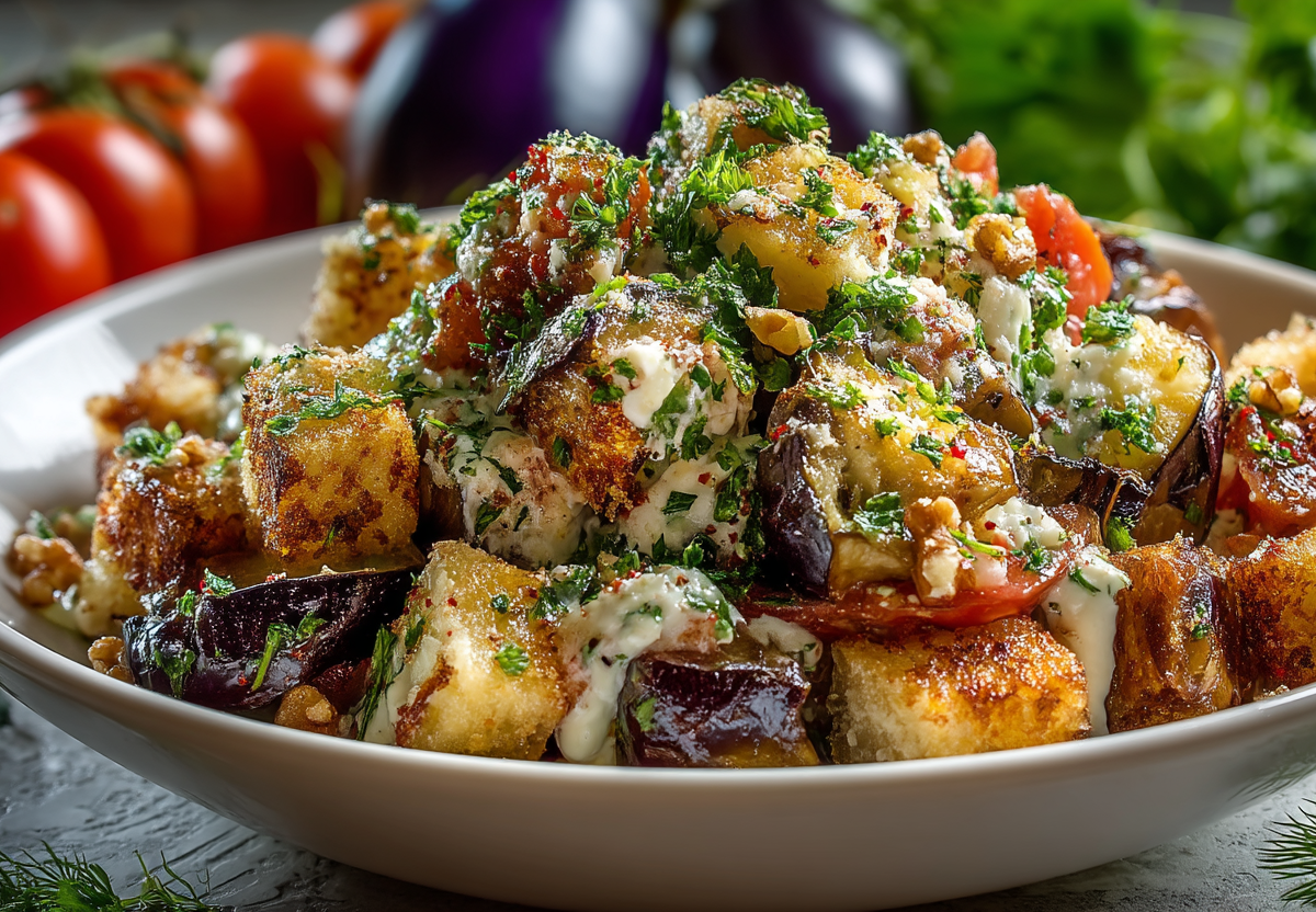 Грузинский салат с запеченными баклажанами — это яркое, ароматное блюдо, которое готовится без тонны масла. Баклажаны запекаются крупными кусками в духовке до мягкости и легкого дымка, что придает особую глубину вкуса.