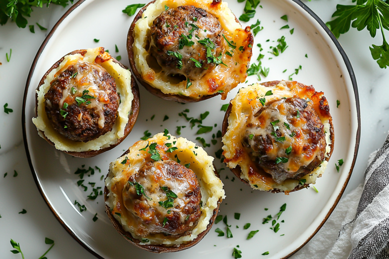 Ставлю формочки на противень и отправляю в разогретую до 190 °C духовку на 35–40 минут. Блюдо готово, когда сыр расплавится и зарумянится, а фарш внутри пропечется. Даю немного остыть в формах, затем аккуратно поддеваю ножом и выкладываю на тарелки.