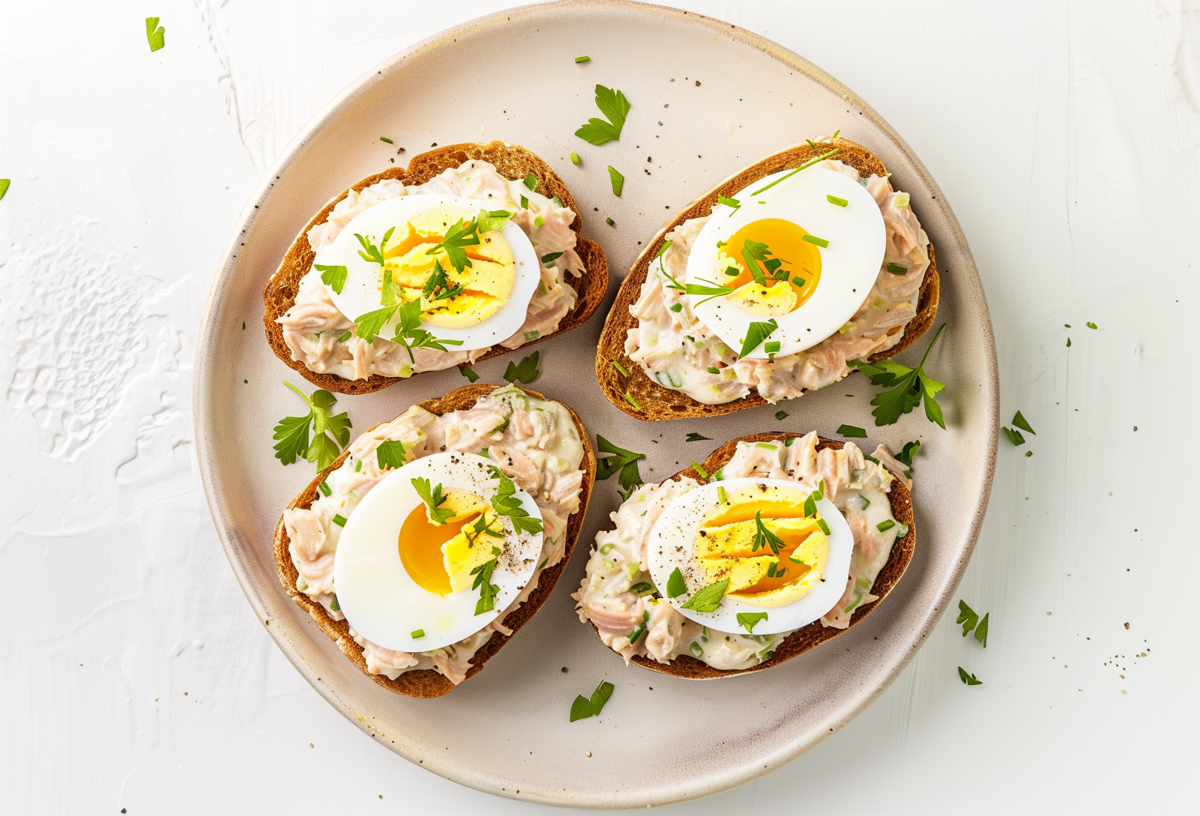 Ломтики хлеба выложите на стол и равномерно распределите рыбную массу. Сверху аккуратно разместите половинки яиц. Перед подачей посыпьте свежей зеленью — она добавит аромата и сделает закуску более яркой.