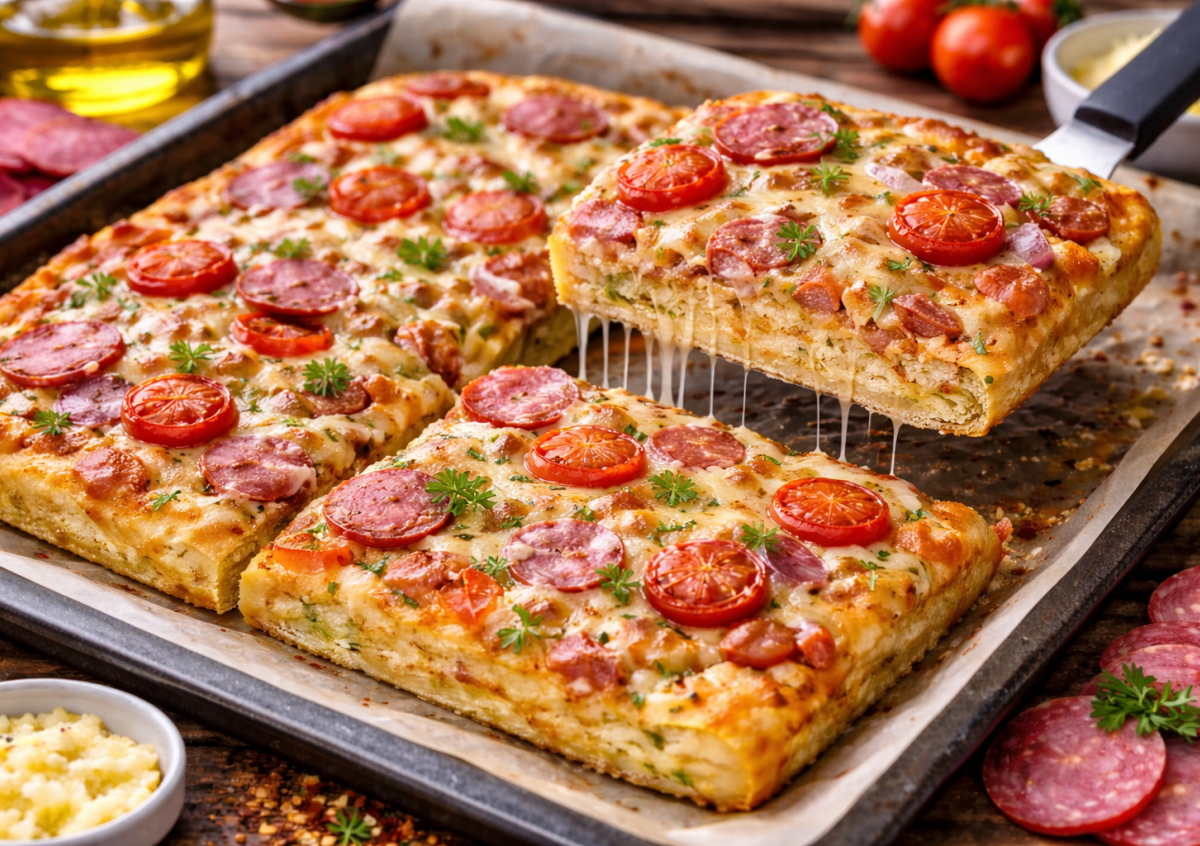 Фишка в заливном тесте: оно получается нежным, хорошо пропекается и отлично держит любую начинку. По сути, это гибрид пиццы и запеканки, который всегда удается.
