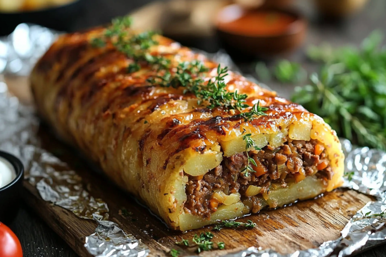 Бюджетный вариант изящного горячего на Новый год: картофельный рулет с мясной начинкой