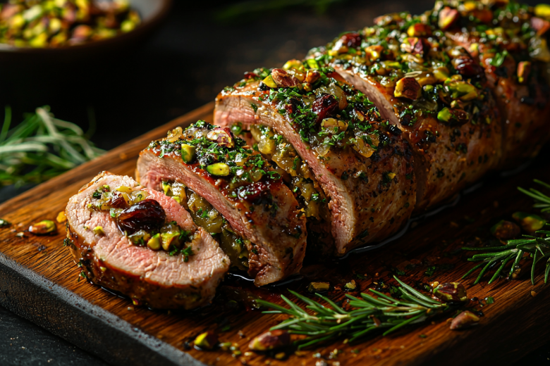 Свиную вырезку промываю, обсушиваю и делаю глубокий надрез по всей длине, не прорезая до конца, — должен получиться «карман». Чеснок пропускаю через пресс, смешиваю с размягченным сливочным маслом, солью, перцем и щепоткой чили. Этой смесью натираю вырезку снаружи и внутри надреза. Чернослив нарезаю тонкими полосками, фисташки мелко рублю. Начиняю «карман» в мясе черносливом и фисташками, равномерно распределяя начинку. Закалываю края зубочистками или перевязываю кулинарной нитью. Оставшиеся фисташки мелко дроблю и обваливаю в них мясо со всех сторон, слегка вдавливая орехи в поверхность. Выкладываю вырезку в форму для запекания. Запекаю в разогретой до 180 °C духовке 45–60 минут (в зависимости от желаемой степени прожарки). Даю мясу отдохнуть 10–15 минут под фольгой перед нарезкой. Подаю, нарезав толстыми ломтиками, чтобы была видна начинка.