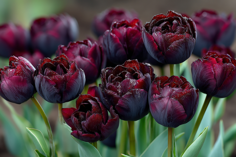 В зависимости от освещения их окрас переливается от глубокого пурпурного до антрацитового, создавая драматичный контраст с яркими красками сада. Эти тюльпаны распустятся уже в конце апреля, достигают высоты 50-70 см и великолепно смотрятся как в монохромных композициях, так и в сочетании с белыми, розовыми или желтыми сортами, подчеркивая их яркость.