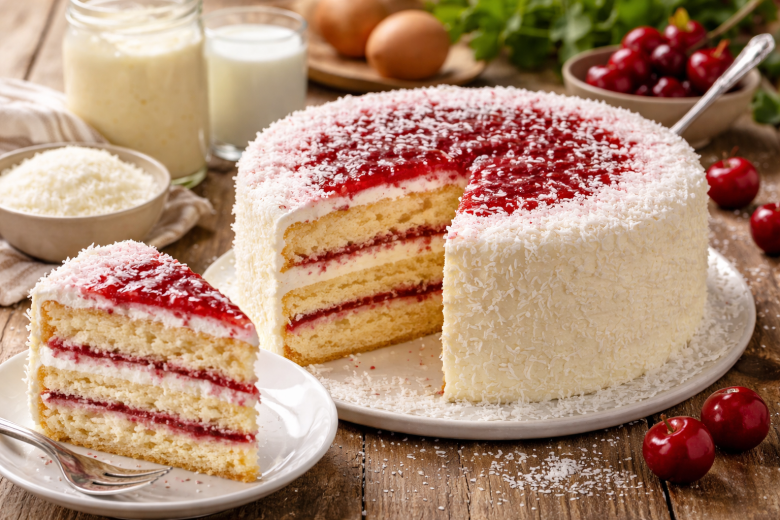 Бисквит разрезают на три коржа, промазывают кремом и собирают торт. Сверху наносят тонкий слой вишневого джема и посыпают кокосовой стружкой. Торт получается мягким и сочным даже без дополнительной пропитки.