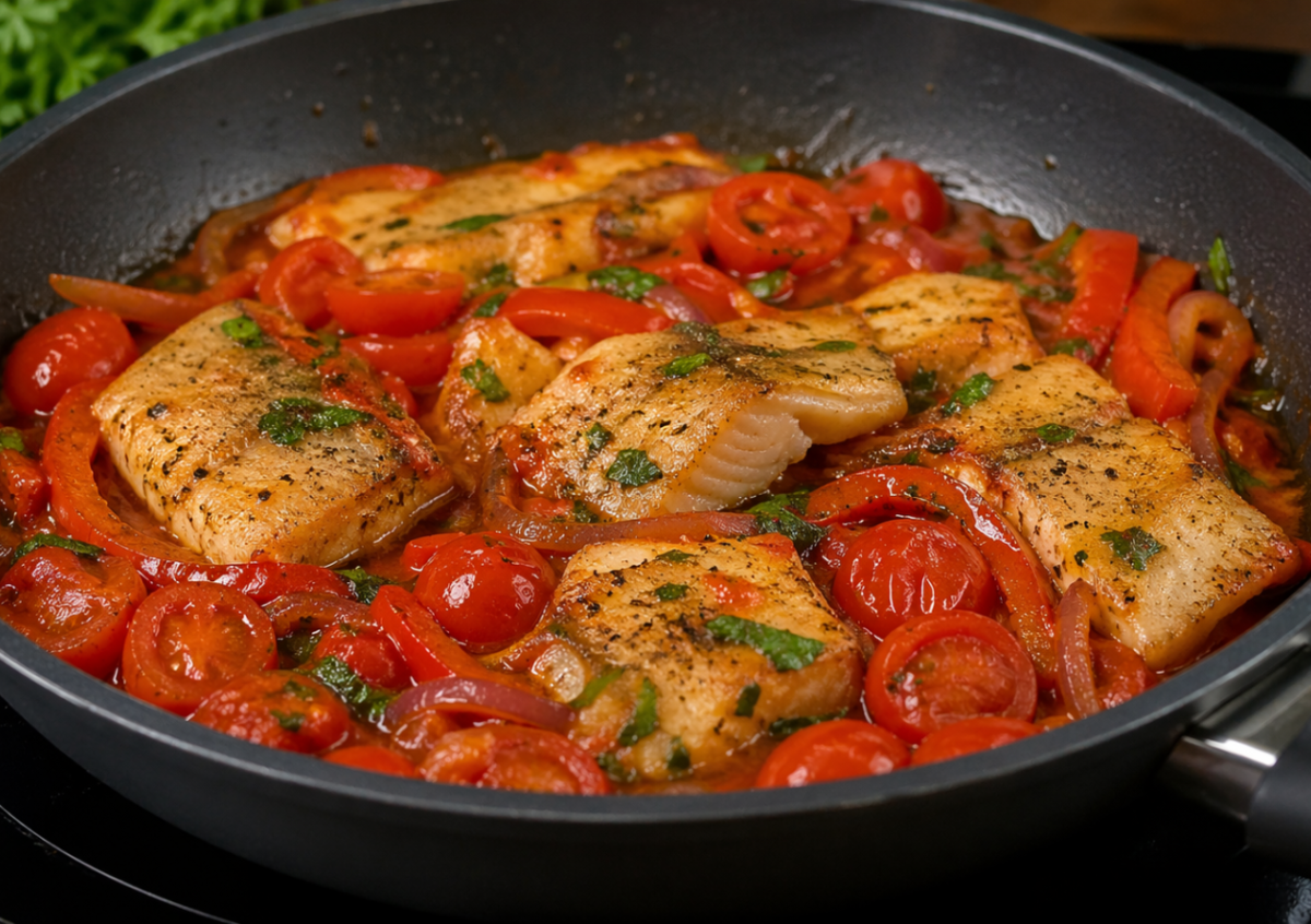 Получается очень гармонично: нежная рыба с румяной корочкой, сочные томаты, сладкий перец и легкая пикантность чеснока. Соус пропитывает кусочки, делая их мягкими и насыщенными по вкусу.