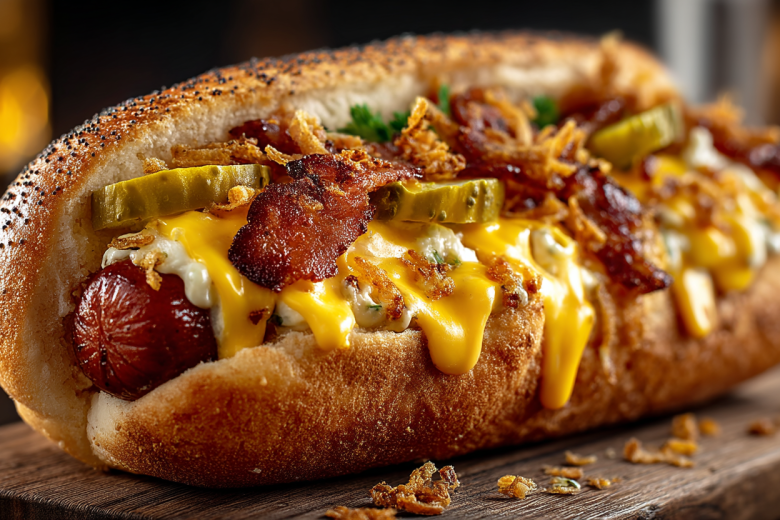 Духовку разогреваю до 180 °C. Сосиски оборачиваю полосками бекона по спирали, чтобы бекон покрывал их полностью. Противень застилаю пергаментом, выкладываю сосиски в беконе и отправляю в духовку на 10–13 минут, пока бекон не станет хрустящим и румяным. Булочки для хот-догов разрезаю вдоль, но не до конца, и немного прогреваю в духовке (можно вместе с сосисками в последние пару минут). Внутрь каждой булочки кладу плавленый сыр (если ломтики — разламываю). На сыр выкладываю горячую сосиску в беконе. Сверху поливаю кетчупом, майонезом и горчицей. Посыпаю мелко нарезанными маринованными огурцами, красным луком и жареным луком. Подаю сразу, пока булочка теплая, а сыр тягучий.
