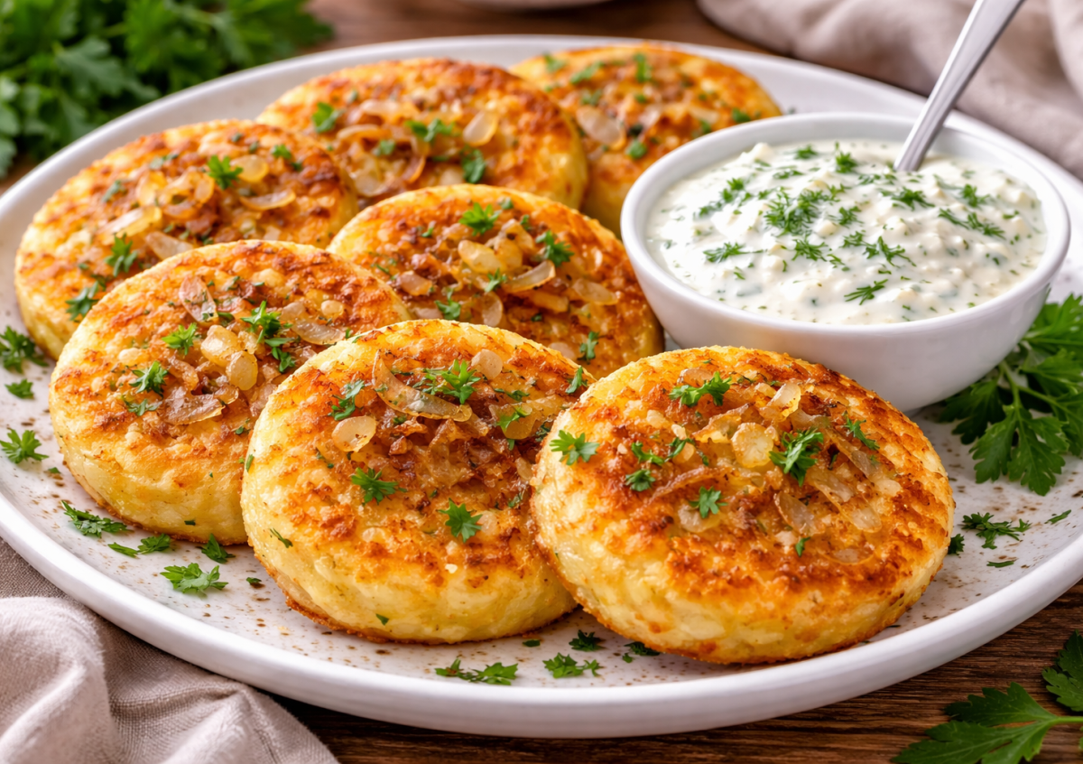 Картофель очистите, нарежьте и отварите до мягкости, затем разомните в пюре. Добавьте соль, перец и крахмал, тщательно перемешайте до плотной массы. Лук нарежьте мелко и обжарьте до золотистого цвета — он добавит сладость и насыщенный вкус. Вмешайте жареный лук, сформируйте из картофельной массы небольшие лепешки. Обжарьте лепешки на разогретом масле с двух сторон до румяной корочки. Для соуса смешайте мягкий сырок со сметаной, добавьте измельченный чеснок и зелень.