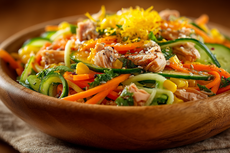 Для приготовления понадобится: 1 крупная морковь, 1 свежий огурец, 1 болгарский перец (красный или желтый для сладости), 150 г копченой куриной грудки без кожи, 3–4 ст. л. консервированной кукурузы. Для соуса: 3 ст. л. нежирной сметаны (10–15%), 1 ч. л. дижонской или зернистой горчицы, соль, черный перец, 1 ч. л. лимонного сока.