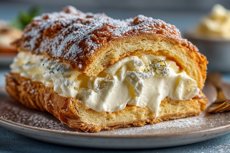 Выньте, полностью остудите на решетке. Для крема 250 мл холодных сливок 33% взбейте миксером до устойчивых пиков. В отдельной миске смешайте 180 г сгущенного молока и 100 г творожного сыра (типа филадельфия) до гладкости. Лопаткой аккуратно вмешайте творожную смесь во взбитые сливки до однородности. Переверните остывший корж на новый лист пергамента. Распределите крем по всей поверхности, отступая 2-3 см от одного короткого края. Аккуратно, с помощью бумаги, сверните корж в тугой рулет, начиная со стороны, покрытой кремом до края. Заверните рулет в пергамент и уберите в холодильник минимум на 2 часа для пропитки и стабилизации. Перед подачей можно посыпать сахарной пудрой.