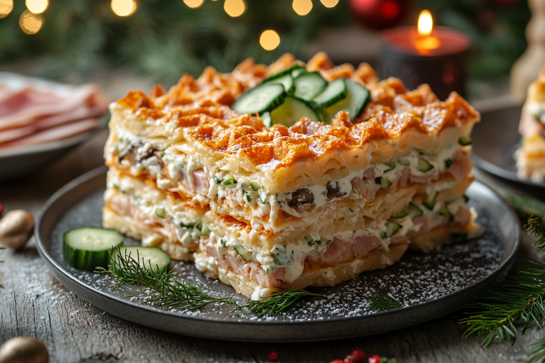 Вам понадобится: 2 упаковки готового слоеного бездрожжевого теста, 2 банки консервированного тунца в собственном соку или масле, 4 отварных яйца, 200 г твердого сыра, 200 г майонеза, соль и перец по вкусу. Сыр натрите на мелкой терке. Тунца разомните вилкой, удалив крупные кости, если они есть, и смешайте с 2–3 ст. л. майонеза. Вареные яйца натрите на мелкой терке и также смешайте с небольшим количеством майонеза. Разогрейте духовку до 200 °C. Тесто раскатайте в тонкие прямоугольные пласты по размеру вашего противня. Выпекайте каждый лист 10–12 минут до подъема и легкого золотистого цвета. Готовые коржи полностью остудите. На блюдо выложите первый корж, равномерно распределите на него половину тунцовой начинки. Накройте вторым коржом и распределите слой из тертых яиц. Третий корж покройте оставшимся тунцом. Четвертый корж смажьте майонезом и щедро посыпьте тертым сыром. Собранный торт уберите в холодильник на 2 часа для пропитки.