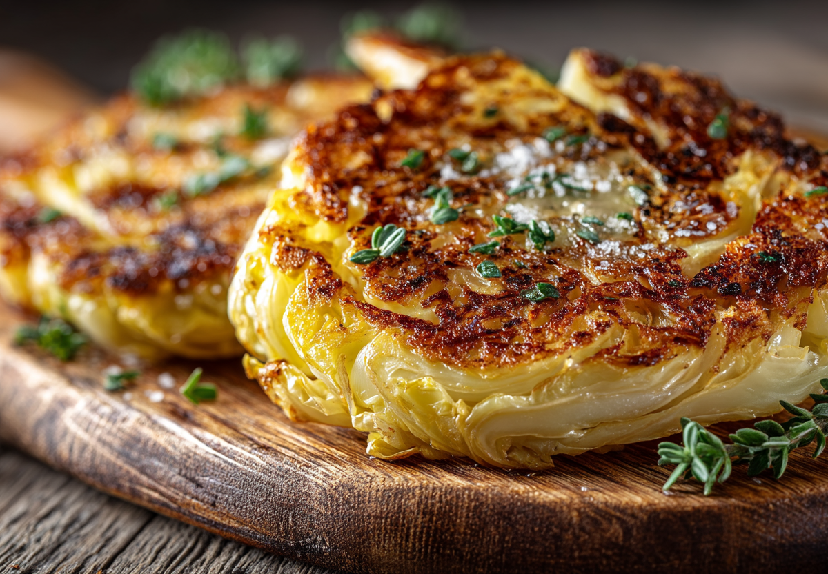 Капуста белокочанная (плотный кочан) — 1 шт. (небольшой), вода — 1,5–2 л, соль — 1 ст. л. + по вкусу, масло растительное — 3 ст. л., тимьян сушеный — 1 ч. л., перец черный молотый — 0,5 ч. л., чеснок сушеный (гранулы или порошок) — 1 ч. л., перец чили молотый (опционально) — щепотка, масло оливковое (для жарки) — 1–2 ст. л., сметана или греческий йогурт (для подачи) — по вкусу.