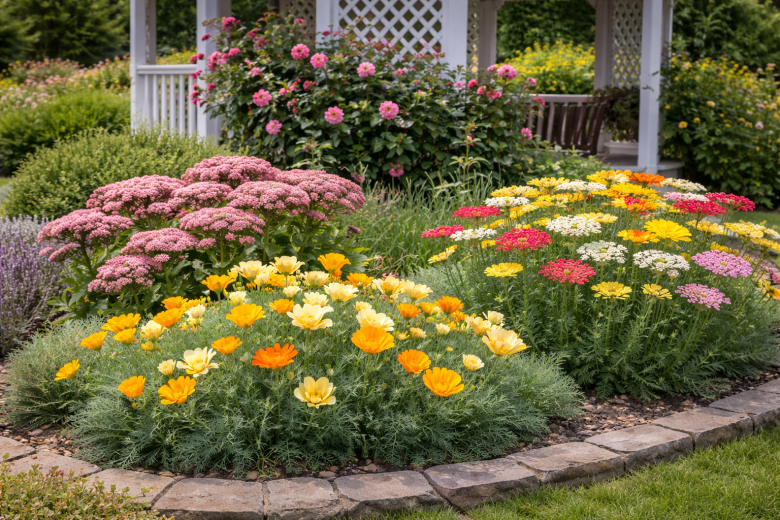 Тысячелистник декоративный — еще один неприхотливый долгожитель для сложных участков. Его высота достигает 60–80 см, а плотные соцветия бывают белыми, желтыми, розовыми и красными. Цветет все лето и часто повторяет цветение осенью. Живет на одном месте до 7–10 лет. Морозостойкость высокая — до –40 °C. Интересный факт: тысячелистник улучшает почву вокруг себя и помогает соседним растениям расти лучше.